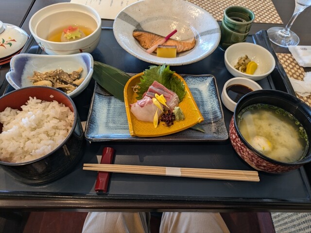 山王病院の山王御前 刺身もコリコリ新鮮で、馬鈴薯饅頭の餡掛けが上品で、全てのお料理が塩分控えめ出汁のきいたは和食ランチ。ご褒美を贅沢に堪能できました。お天気も良く窓からの景色にも癒されました。デザートも甘さ控えめで最高でした。