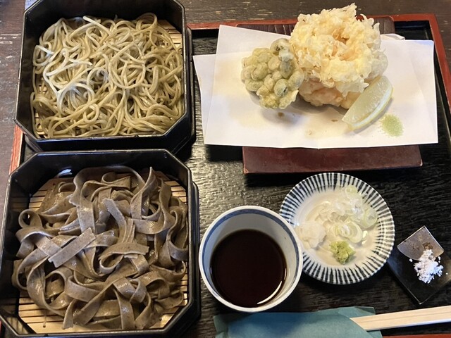 献立と格闘する事、5分…お店の方に「二色粗挽き蕎麦」と「天ぷら」を一緒に食べたいと相談すると、ほぼ全てのメニューに+¥500で粗挽き蕎麦に変更する事が可能とのことでした。
