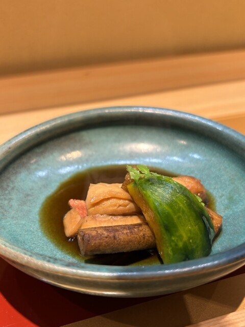 炊き合わせは坊ちゃんカボチャと牛蒡。葉山椒が乗っている。メインの八丈島産金目鯛煮付け。なんと砂糖を一切使っていないとの事。酒を浴びるほど入れているそうだ。ほのかな甘みで、これまた美味しい。