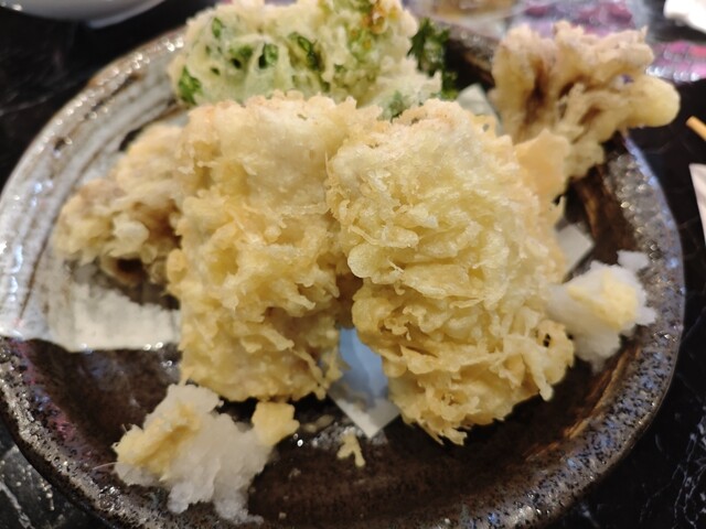 衝撃のボリューム: 皿の上には、肉厚で巨大な穴子が鎮座。さらに驚くべきは、そこに舞茸と菜の花の天ぷらまで添えられていたこと!