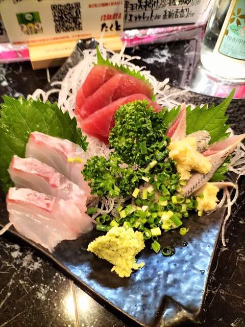 刺盛り(左から長崎のイヤゴハタ、近海の上バチマグロ、北海道のいわし)