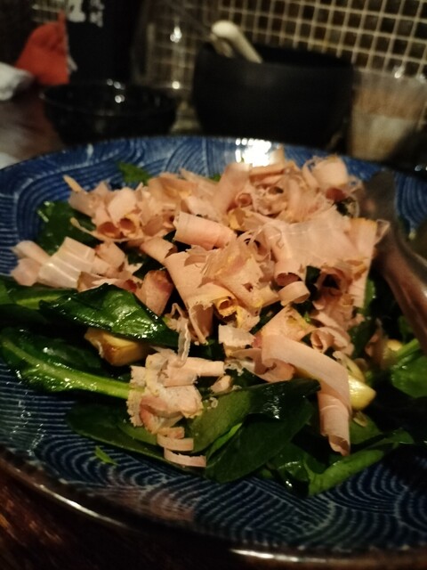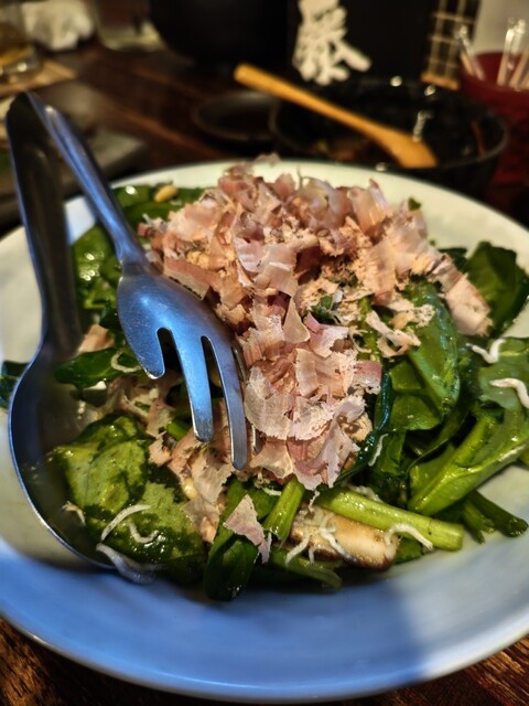 普段、外食でサラダを頼むことは少ない私ですが、ここでは別。野菜そのものの力が強い囲坊主さんにおいて、このホウレンソウサラダは**「超絶レギュラー」にして「サラダ界の不動のエース」**。瑞々しい葉と、重なり合う具材の旨みは、今夜も完璧なスタートを飾ってくれました。
