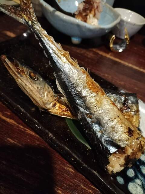 焼きサンマ:今夜のメインイベント。焼き上がりまで約1時間という時間をかけて、じっくり、丁寧に火を入れられたサンマです。驚くべきは、頭から尻尾、骨まで全て余すことなく食べられること。 凝縮されたワタの苦味と身の甘み、そしてパリパリに焼き切られた皮目。これぞ職人技の極致です。