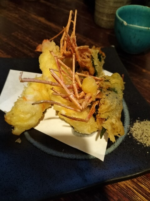 熟成イカのかき揚げ:かき揚げといえば野菜たっぷりのイメージですが、こちらは熟成されたイカとアスパラのみという贅沢な構成!アスパラは単品のオススメにも入っていたので、なんだか得をした気分です。凝縮されたイカの旨味と、アスパラの瑞々しさがサクサクの衣の中で見事に調和していました。