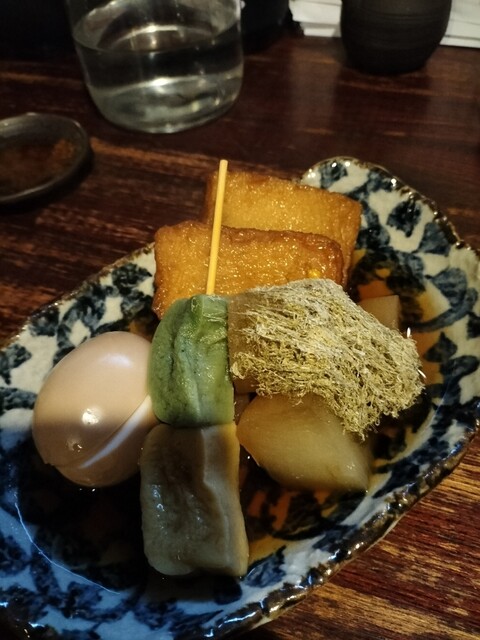 おでん:今冬のおでんは、大根と卵に日替わり2種を加えた盛り合わせスタイル。この日は、目にも鮮やかな「白と緑のはんぺん(?)」と、粒々の食感が楽しい「とうもろこしの練り物」が登場。お出汁をたっぷりと吸い込んだ大根は、箸がスッと通る柔らかさで、冷えた身体にじんわりと染み渡る優しさでした。