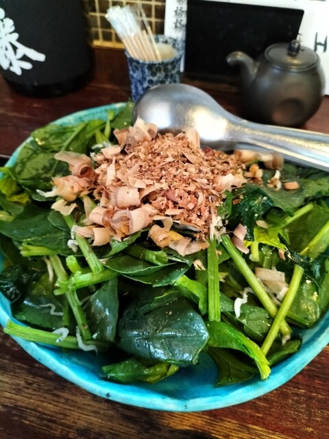 今月は何といっても、お気に入りの「ホウレンソウサラダ」と「シイタケ肉巻き」がメニューに復活!席に着くなり、迷わず注文させていただきました。