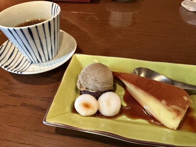 デザートは手作りのプリンがとてもおいしかったです!抹茶のアイス、白玉団子はもっちり、ドリンクはホットコーヒーを選びました。