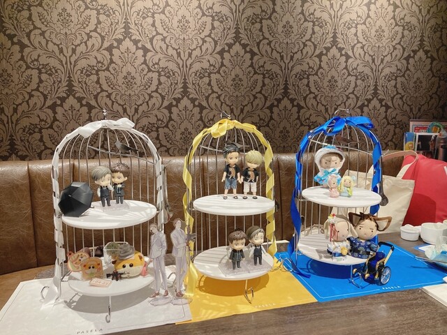 パセラの推し色アフタヌーンティーは、11色から選べます。2段のスイーツスタンドに、セイヴォリーと推し色ドリンク付き。3人で予約し、色は青、黄色、白。前もって色を伝えていたので、部屋に入った時点で、推し色のマットと紙ナフキン、お品書きがテーブルセットされていました。10分ほどして、お料理登場。鳥かごのスタンドには、ミニパフェ、プリン、ガトーショコラ、季節のジュレ、レインボークランチ、マドレーヌ、マカロン、プチカラーハニトー。リボンをはじめ、ドリンク、マカロン、飾りの飴細工やモナカがそれぞれの推し色になっています。白はきれいだけど、他に比べると地味かも。