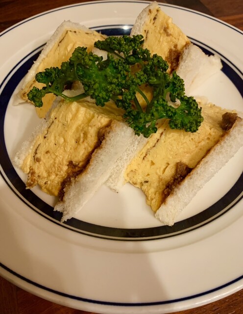たまごサンドは分厚いだし巻きでパン自体に味噌が塗ってるのがすごくおいしい。出来立てで提供してくれるからしっとり温かいのがほっとする味になるよ。