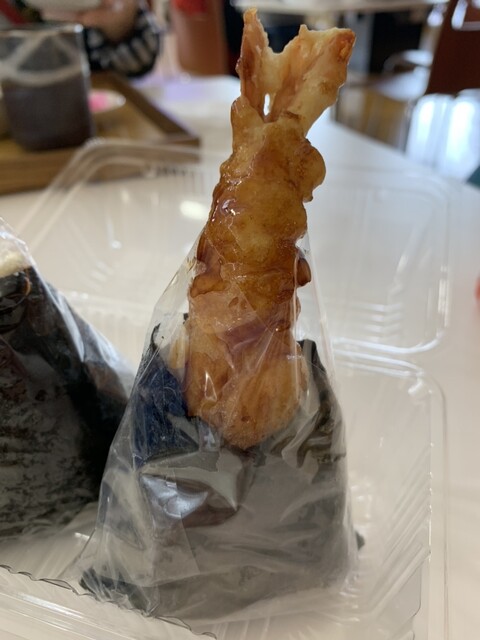 三角形のおにぎりから刺さりそびえ立つ大きな天むすがインパクト大。