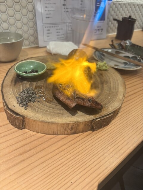 しめ鯖、和牛肉寿司、燻製チーズが、炎とともに香ばしさをまとって登場。テンションもアルコール度数も急上昇。