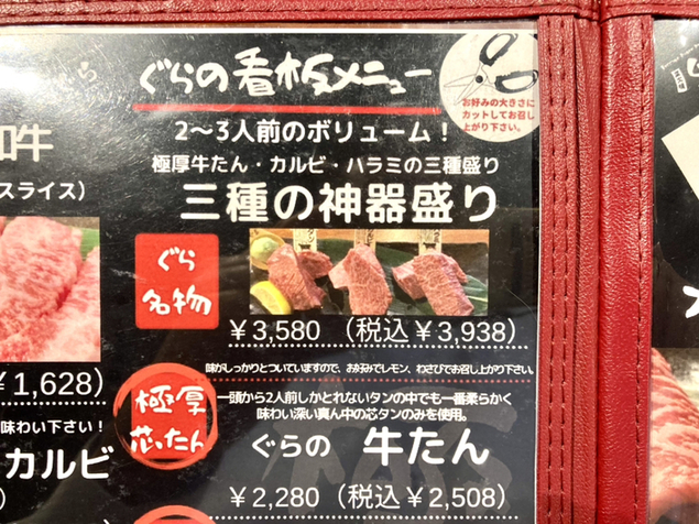 三種の神器盛り 左側から牛たん・カルビ・ハラミ