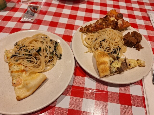 とってもカジュアルな食べ放題!サラダ、パスタ、カレー、ポテト、マカロニチーズ、唐揚げ、ピザ(10種類以上!)など!ソフトドリンクも飲み放題!で、私たちが行った平日の夜は2時間制で大人は2250円でした。18時30分ぐらいに入店しましたが、予約なしでまったく問題なし(というか、ガラガラ)。