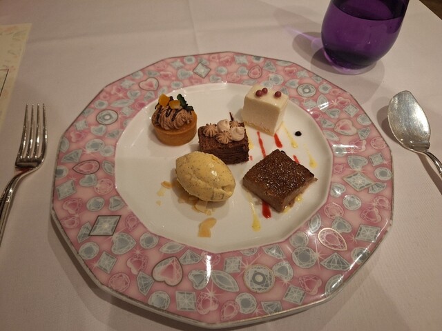 デザートの盛り合わせ、ウキウキ!以前は、シャーベットとアイスは別皿でサーブされていたのですが、今は一つのお皿に集約されたようです。