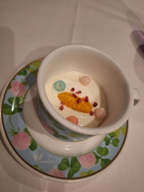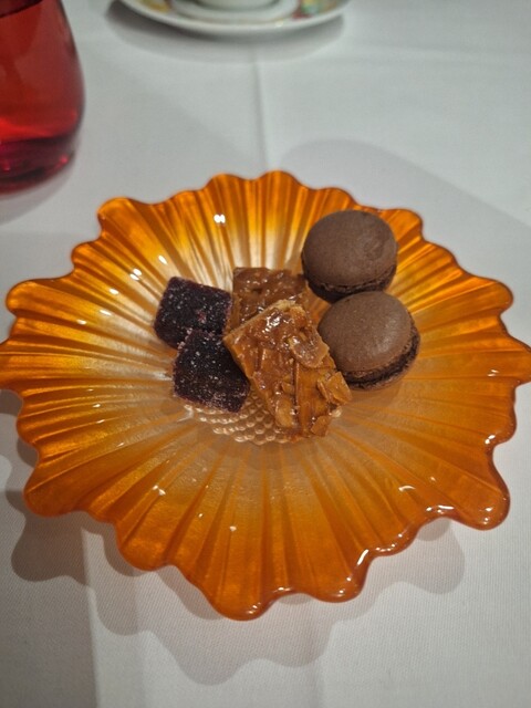 どのお皿も、期待以上!本当においしい~!特に今回は、2番目の前菜の”金時人参スープ ごぼうのフランにパリパリごぼう”が、優しくて甘くて、おかわり欲しい!くらいでした。メインに選んだ石川県能登牛(+1650円)は、さしは多くないのに柔らかで程よい噛み応え、最高!河野シェフがデザインされたお皿も、とっても可愛いです。本物の花びらやお花使いも素敵~。