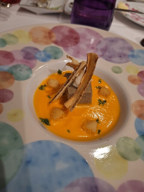 金時人参のスープ ごぼうのフランにパリパリのごぼうを添えて