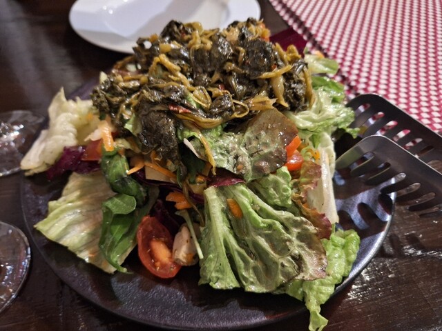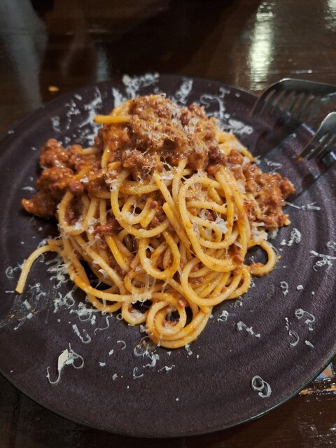 入口に近い壁際のテーブル席。隣のテーブルとは間隔がとってあります。家族と二人でお伺いして、田舎風サラダ1500円、ビザ:ポポナーレ(ブッファリーナとピッコラターヴォラのハーフ&ハーフ)3000円、パスタ:ミートソース1900円を注文しました。