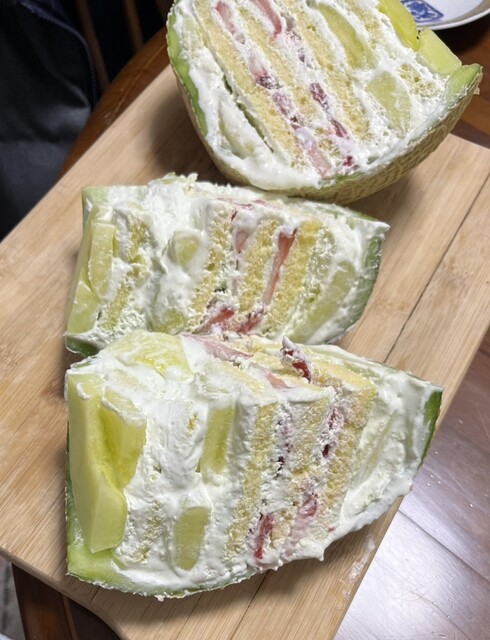 このケーキには感動しました。まるごとメロンがケーキになっています。スポンジもクリームもフルーツも全ておいしい切り方が汚くておいしさが写真から伝わらないかもしれません。これはリピートです。おしゃれでプレゼントにも良いです。