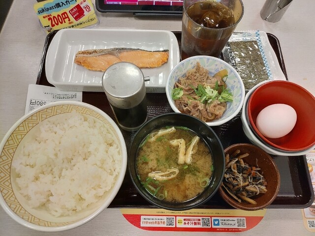 今朝は、すき家@金沢八景にて、鮭定食を食べてみました。美味しかったです。
