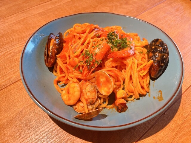海老とモッツァレラチーズのカルボナーラチリトマトソース