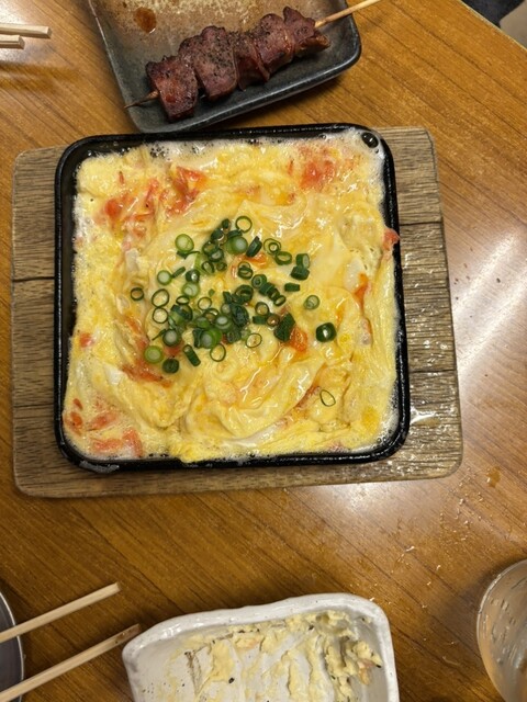 さらに鉄板で提供される玉子料理も人気メニュー。とろとろ半熟に仕上がった卵と具材が絡み合い、優しい味わいで箸休めにも最適。濃い味のもつ焼きとのバランスが絶妙です。