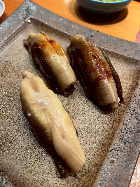 いただいたのは、ウニの海苔巻き、赤貝の刺身、そして握りの数々。中でも印象に残ったのが“穴子”と“トロたく”。穴子は塩とタレの二種で提供され、ほろりとほどける柔らかさと香りが絶品。口の中でふわっと溶ける食感は思わず目を閉じたくなるほど。