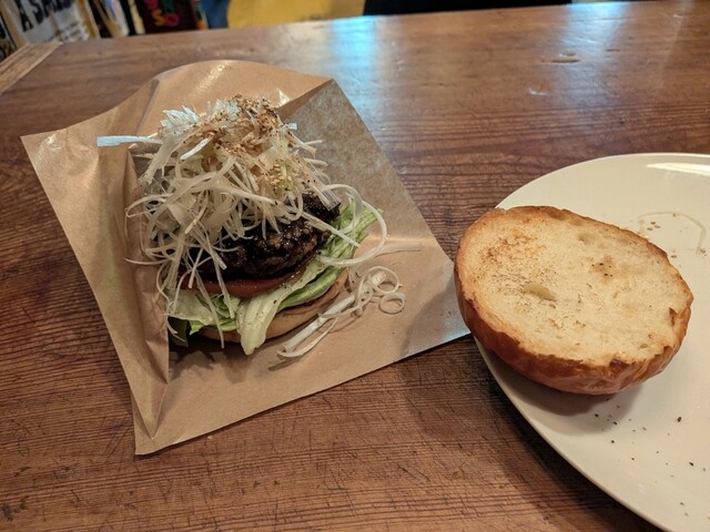 来ましたね〜。美しいBURGER。zopfさんのバンズ。カボチャの種があしらわられていて、艶が良く、ブロンズ色。