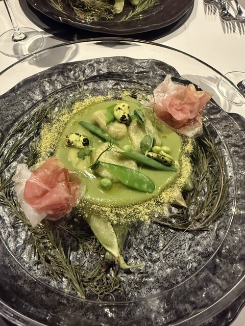 → そら豆のニョッキ、サンド豆、きぬさやにお豆のオイルがかかった一品