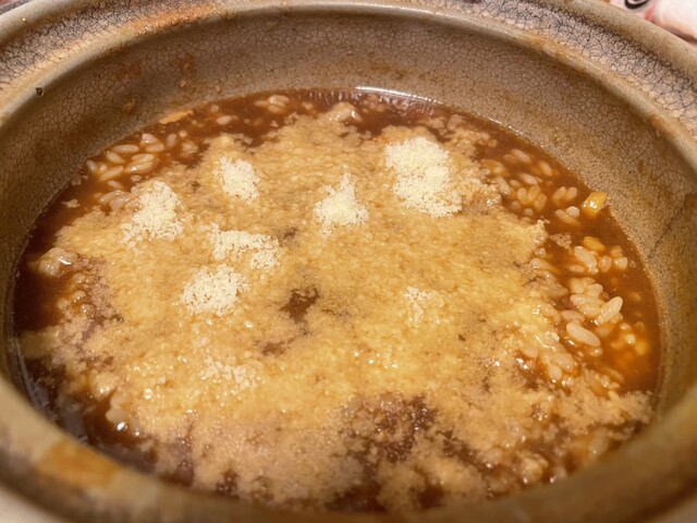品書きの横に「〆用のチーズ」なんて書いてあるじゃないですか!もう我慢できずにチーズも追加注文してしまいました。具を全てあげ、汁を少し楽しんだ後にご飯と粉チーズを投入!もう合わない訳がない!Go to heavenです。