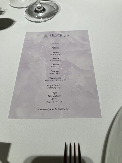 久しぶりの宇都宮の地産地消フレンチで有名なオトワレストランに来訪。 3度目となるが、一流店らしいアテンド、料理のオリジナリティ、ペアリングのワイン等久々の感動がよみがえる。