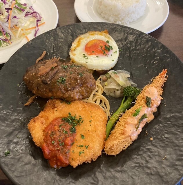 今回はランチの中から『ハンバーグ&チキンカツ&エビのフリット』を選びました。