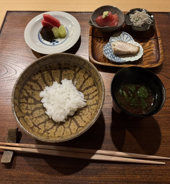 ちしゃとう(茎レタス)の床漬けなどの香の物に鮪とサーモンのお造り、縮緬雑魚、焼魚にお味噌汁とご飯で〆となります。