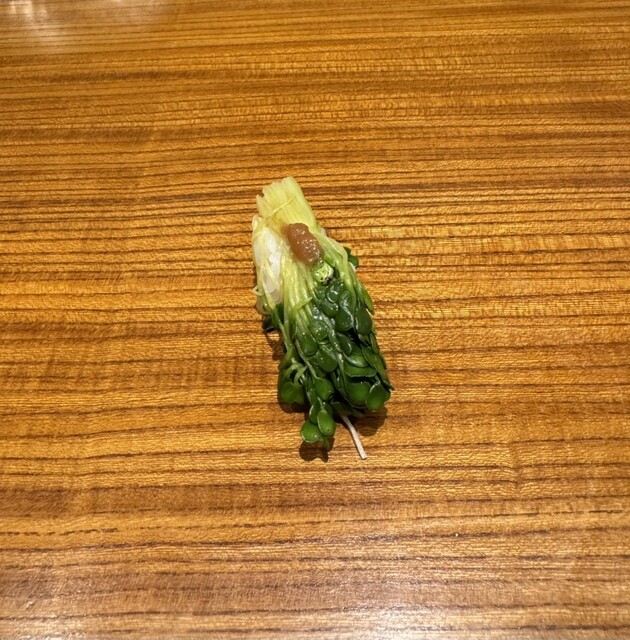合間に供された土耕栽培のカイワレの握りも印象的。シャキッとした歯触りと爽やかな辛味が口の中を整える一貫で今では博多でも老舗「おさむ」などでしか見られないという粋な仕事。こんな一手に博多寿司の系譜と大将の遊び心が感じられる。