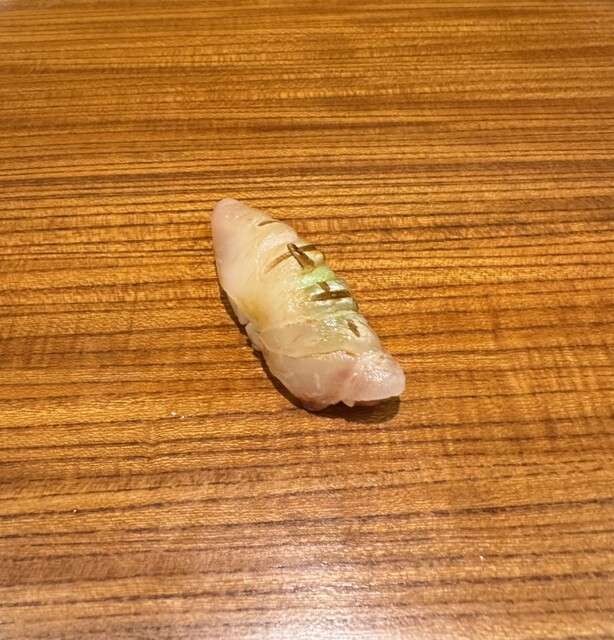 まずは「今日は釣りのシマアジがいい」と差し出された一貫と、それを見守る大将の嬉しそうな笑顔。軽く塩を当て、柑橘の香りを添えた握りは、しっかり酢の効いた舎利と脂の乗った身が見事に調和し、一口でこの日の流れを決める存在感。