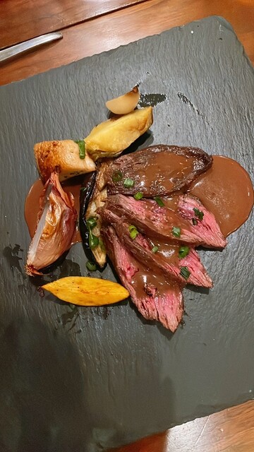 シャルキュトリー、エスカルゴ、キノコのブリオッシュ、メインにホタテとお肉。