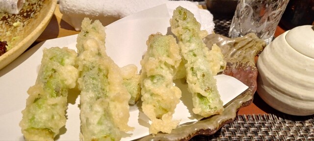 日本酒(十四代)利き酒セット、アスパラの天ぷら