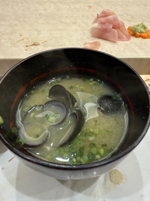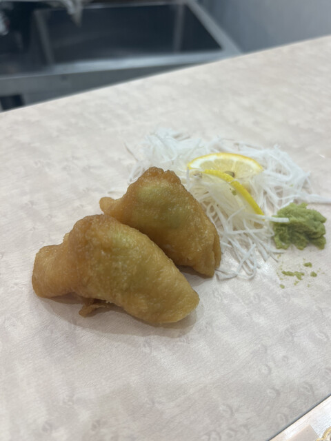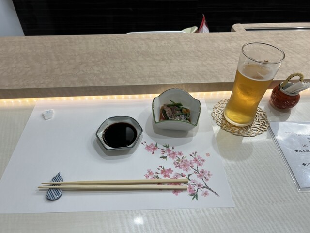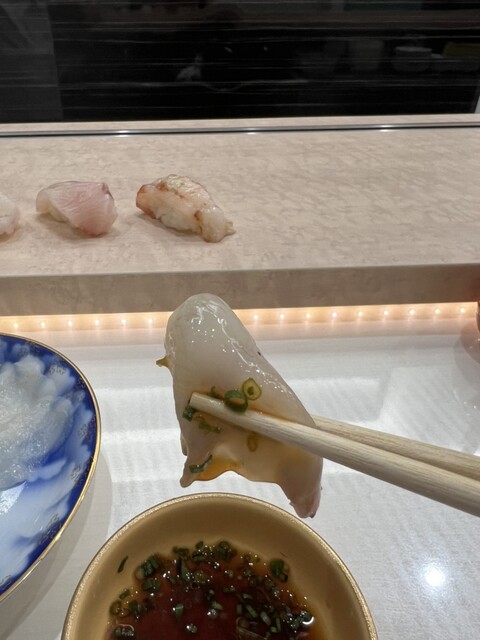 付き出し、刺身(わさびおろし立て)土瓶蒸し、天ぷら(甘鯛、イカ、甘鯛ウロコ(驚愕の美味さ))、にぎり(あじ、マグロ、ウニ、イカ、日によって違うらしい)と板さん(大将)お任せで少しずつ一品一品堪能して納得の味。