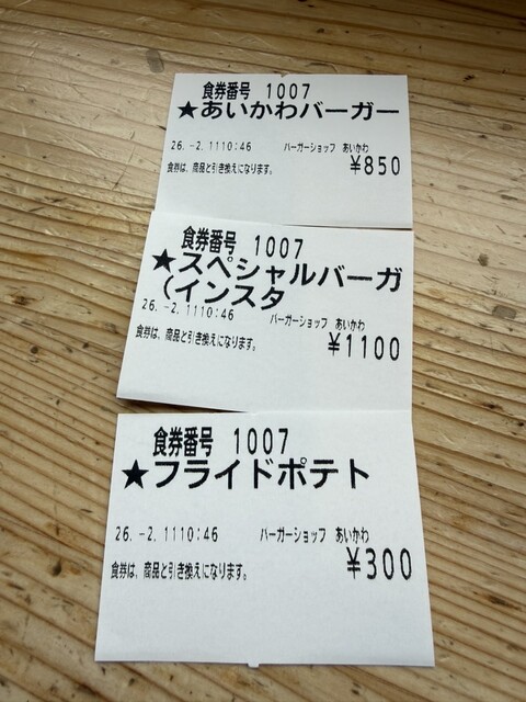 今月のみのスペシャルバーガーとあいかわバーガーを注文。