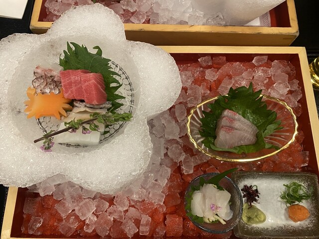 お造りには、トロ、フグ、タイ、ブリなどなど。メインの霜降りのお肉のお鍋!サイコーに美味しかったです。アルコールも飲み放題!!