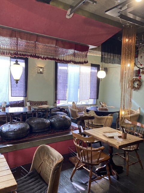 大きいテーブルの上のランプや、お花のライトや布がここの世界観を作ってる