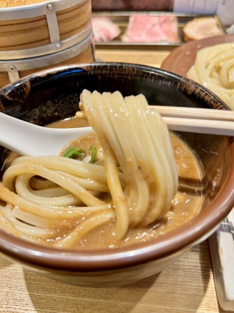 まずは麺を少しだけつけ汁に付けて食べる。極太麺が食感も良く小麦を感じて美味しい✨