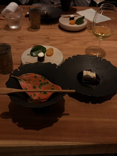 どのお料理も美味しかったですが、個人的には鴨に蜂蜜と竹炭塩とオリーブオイルを合わせた一品、小ヤリイカと黒米にヴェルガモットの香りが添えられた一品が印象的でした。
