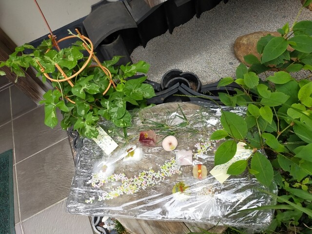 当庵では、赤ん坊のようなやわらかな羽二重餅にとろけるほどの漉餡を包み、この形を維持させるために薄く錦玉羹を掛けます。口の中で溶ける前に喉元を通りすぎてしましまいそうなそれはそれはうんわりと軟らかなお菓子です。