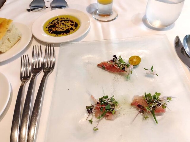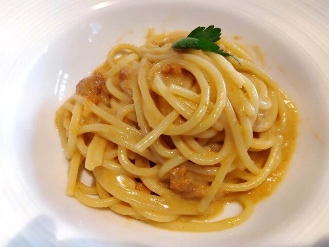 2回目だったので、お勧めを聞いたところ「ウニのパスタが売り」という話でた。 パスタだけでは寂しかったので、コースを注文しました。 ウニのパスタの時パルメザンチーズとチリ(鷹の爪?)が出てきたので、チリだけ少しかけて食べました。 僕的には美味しいパスタでした!