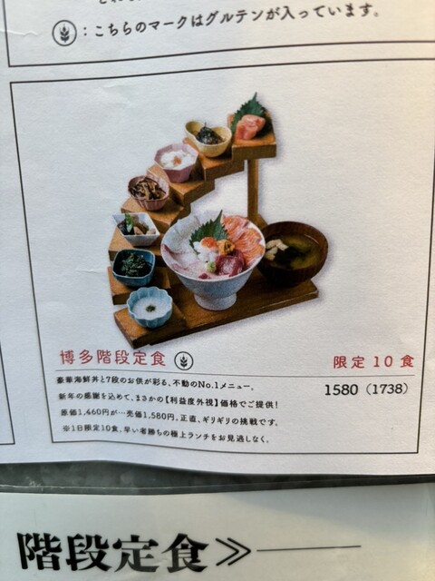 1月最高気温8度の中、限定10食の博多階段定食をGETするべく10時40分にはお店へ。。。先客1名様の後ろへ並び2番3番の順番を確保!オープンする頃には6名ほどお並びになられてました。オープン10分前には店員さんから限定10食博多階段定食注文なのか聞かれそうであれば博多階段定食引換券を渡していただけたので、バタバタと注文することもなくなったので安心してゆっくり店内へ。。。引換券を渡しオーダー完了。
