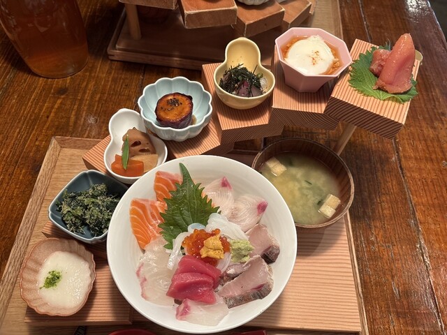 まず出てきたのは冷たいお茶です。いろんな茶葉が混ざっているような健康茶な味がします。美味しいです。オーダーした階段定食は5分程ですぐに出てきます。感動する速さです。こんなに素晴らしいお料理が20分ほど寒空の中待てば驚くほど安くいただくことができるのかと感動です。海鮮丼に乗ってるお刺身も新鮮で更には分厚くめちゃくちゃ美味しいです。どれも格別に美味しいですが、ごま鯖と大学芋!忘れられない美味しさに出会ってしまいました。また、ワンコメニューもあり、ワンコ様もたくさんです。席は人様と同じ扱いでどこでも座れるのでワンコ嫌いな方は戸惑われるかもしれません。しかし、わんこを飼ってる身としてはこんな素晴らしいわんこに優しいお店がこんなところにあったとはと感動の連続です。