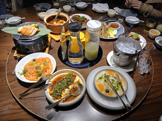 締めのデザートは、マンゴードリンクにタピオカ・グレープフルーツ果肉入り。甘さと酸味、ぷるぷる食感のバランスが心地よく、最後まで楽しい食体験でした。