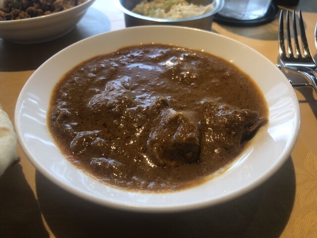 選んだカレーはいずれも唐辛子マーク3つの一番辛いもの。店員さんから辛いけど大丈夫ですか?と聞かれます。僕は大好きなので大丈夫ですと答えます。よくある北インドカレー屋の一番辛いのを選んでもあまり辛くないときが多いですが、アジャンタさんの3辛のカレーは本当に辛い。でも最高にうまい。