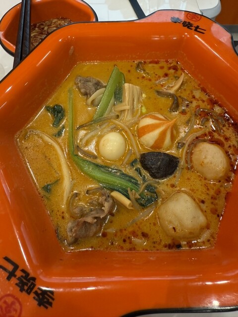周りの人達を見よう見まねで食材を選びました。1000円超えると麺が無料なので、麺は選ばなくていい。羊肉が美味しい。麺は普通のでいいといったら、さつまいも麺と平い麺をハーフハーフで入れてくれました。どちらもおいしかったです。出来たばっかりなのか、店内も清潔でした。