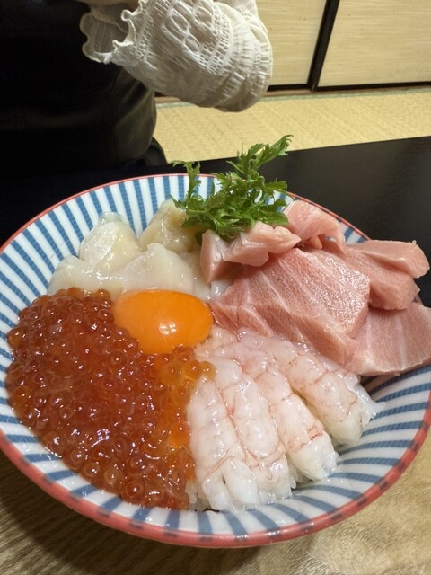 妻は四色丼(ホタテ、いくら、甘エビ、本マグロ)を注文!